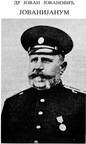 J O V A N I J A N U M 7. avgusta 1908. godine sres. lek. u penziji" Na ovaj način, a po ugledu na Zadužbinu "Velimirijanum", osniva svoju zadužbinu dr Jovan Jovanović, sreski lekar u penziji. Naravno, dr Jovan Jovanović se ni imenom, ni poreklom, a ni veličinom svoje zaostavštine ne može meriti sa svojim prethodnikom i uzorom Velimirom Mihailom Teodorovićem, ali želja da i posle smrti budu od koristi srpskom narodu bila im je ista. Jovan Jovanović je rođen 1845. godine u Smederevu od oca Pavla i majke Milice. Otac, osiromašeni smederevski trgovac, umire rano ostavivši nezbrinutu ženu sa pet kćeri i sinom jedincem. Po nagovoru i uz preporuku svoga učitelja Vukašina, Jovan nakon uspešno završene osnovne škole odlazi za Beograd gde završava gimnaziju poslužujući po bogatijim beogradskim kućama i dajući "kondicije" slabijim đacima. Školske 1866-67. sluša prvu godinu pravnih nauka u Beogradu. Te zime doživljava tragediju koja će uticati na njegovo konačno opredeljenje za budući život. Prvo mu umire najmilija sestra, Sava, ostavivši tek rođene kćeri Anastasiju i Persidu o kojima se Jovan doživotno starao. Sledeći i presudan udarac sudbine bila je smrt voljene devojke Smilje, lepotice iz ugledne kuće Milosavljevića. Smilja je umrla, kako je Jovan kasnije do kraja života govorio, "zbog nebrige lekara". Verovatno su ove surove i nepravedne smrti uticale na to da Jovan napusti tek započete studije prava te odlazi u Beč gde završava medicinu kao državni pitomac. Sa diplomom Bečkog univerziteta dr Jovan Jovanović se vraća u Srbiju ali ne želi da ostane u nekom od većih gradova za koje ga ništa posebno nije vezivalo već se sa svim svojim mladalačkim žarom upušta u borbu protiv zaostalosti i primitivizma, vradžbina i nadrilekarstva najpre u knjaževačkom, a potom i timočkom, vranjskom i pirotskom okrugu. U ratovima od 1876. do 1878. učestvovao je aktivno kao sanitetski poručnik za šta je primio "Spomenicu iz ratova 1876, 1877. i 1878. godine". Dr Jovan Jovanović je još odlikovan Medaljom za četrdesetogodišnjicu velike Sveto-andrejske skupštine i Medaljom Nj. V. Kralja Srbije Petra. Najduži period svoga života i službovanja, kao i vreme posle penzionisanja, dr Jovan Jovanović provodi u Vlasotincima. Nikada nije zalazio u kafane niti se družio s boemima kojima bi na neki način i pripadao kao neženja. Vlasotinački kraj je dugo pamtio ovog požrtvovanog lekara i divnog čoveka poznatog po nadimku Kantakuzen. Ratovi i surovi uslovi života u zaostalim krajevima uticali su na njegovo već narušeno zdravlje te dr Jovan Jovanović odlazi u Karlove Vari, nadajući se da će u toj posve čuvenoj banji uspeti da poboljša svoje zdravstveno stanje, gde umire 15. septembra 1909. godine. Prema želji pokojnika, telo mu je preneto u Beograd i sahranjeno uz sve državne počasti na Novom groblju. Sahrani su prisustvovali članovi Srpske akademije nauka, sveštenstvo, učenici svih škola i mnogi građani. Iz Testamenta dr Jovana Jovanovića izdvajamo: