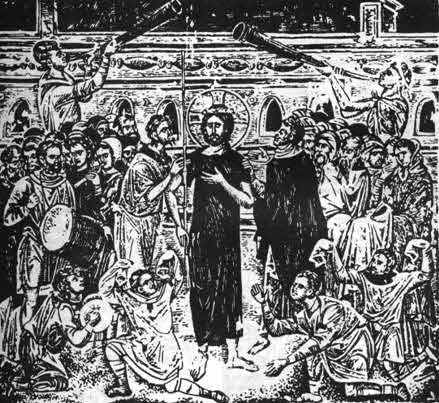 Ismevanje Spasitelja. Freska iz crkve sv. Đorđa u Starom Nagoričanu. Oblast BITOLjA puna je starih crkava srpskih, a isto tako i oblast OSTROVSKOG JEZERA, MOGLENICA I MALA REKA. U KOSTURU za vlade brata Dušanova Simeona (Simše, Siniše) obnovljena je crkva „sv. činonačelnika“ a u XVII veku često se spominje srpski manastir Bogorodice (Uspenje) Kremenečke kod Kostura.U SEREZU za vlade Dušanove spominju se crkve Sv. Jovana i Sv. Nikole.U oblasti DRAME Milutin podiže manastir Bogorodice Kosinice.Sve ove mnogobrojne crkve čine jedno čvrsto jezgro, oko koga se na Severu i na Jugu u gustim oazama grupišu nove crkve. U oblastima Kalabake, Trikale i Janjine pod patronatom cara Simeona, Dušanova brata po ocu, cara Joasafa, sina Simeonova, nazvanoga „otac Meteorskih manastira“ (poslednjega Nemanjića) i „carice“ Anđelije, kćeri Simeonove, podigoše se mnogobrojne crkve. Čak južno od ostrva Krfa na ostrvu Levkadi (sada ostrvo Sv. Mavre) podiže crkvu Sv. Mavre supruga poslednjeg despota srpskog Lazara, sina despota Đurđa, Jeleva, pošto se spasla od jednog brodoloma i u ovome manastiru provede svoje poslednje dane kao monahinja Hipomone, uzevši monaško ime svoje babe, kćeri Konstantina Dragaša.U drugoj polovini XIV veka i u XV veku izbija va površinu veliki broj crkava u dolinama Rasine, Morave, Mlave i Peka. Seobe iz Južne Srbije i iz ostalih oblasti srpskih, koje su u XV veku bile vrlo znatne, a u XVII i u XVIII veku postadoše još veće, pomerile su polje podizanja srpskih crkava daleko na Sever i 1688. god. bila je u Budim Pešti podignuta jedna crkva srpska. U oblastima Rijeke, Zagreba, Varaždina, Temišvara i Karansebeša podigoše se mnogobrojne crkve srpske.